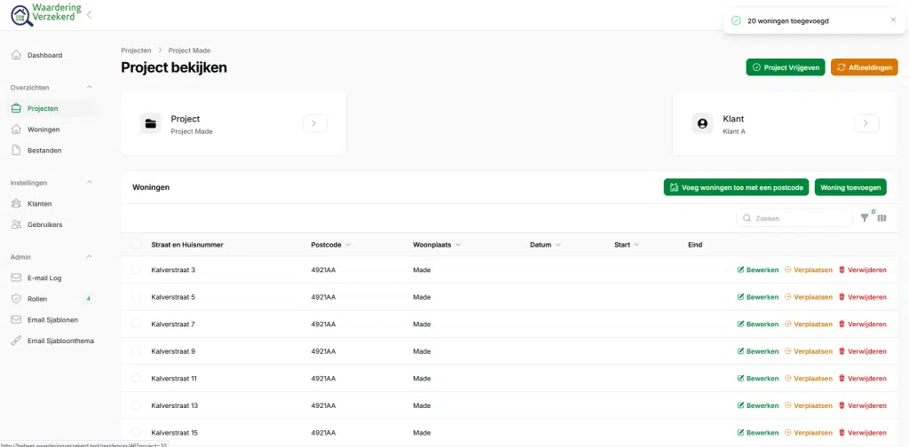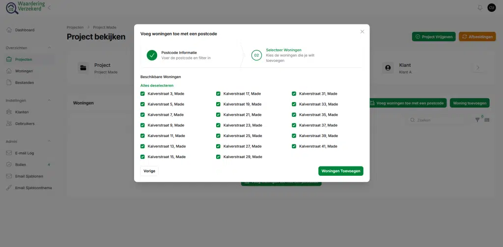 Dankzij integratie met de PDOK-opendataset kunnen woningen eenvoudig en accuraat aan projecten worden toegevoegd op basis van postcode en adresinformatie.